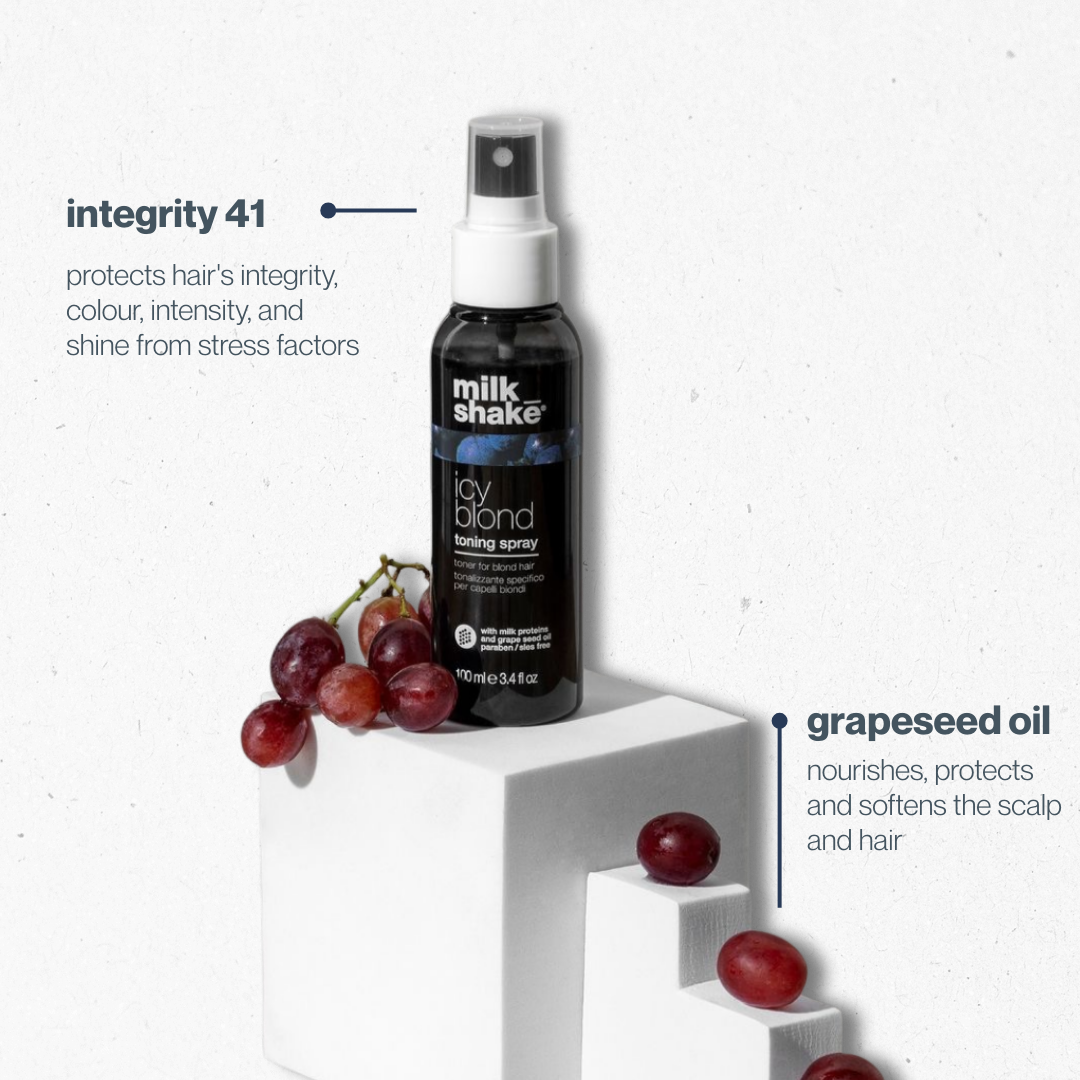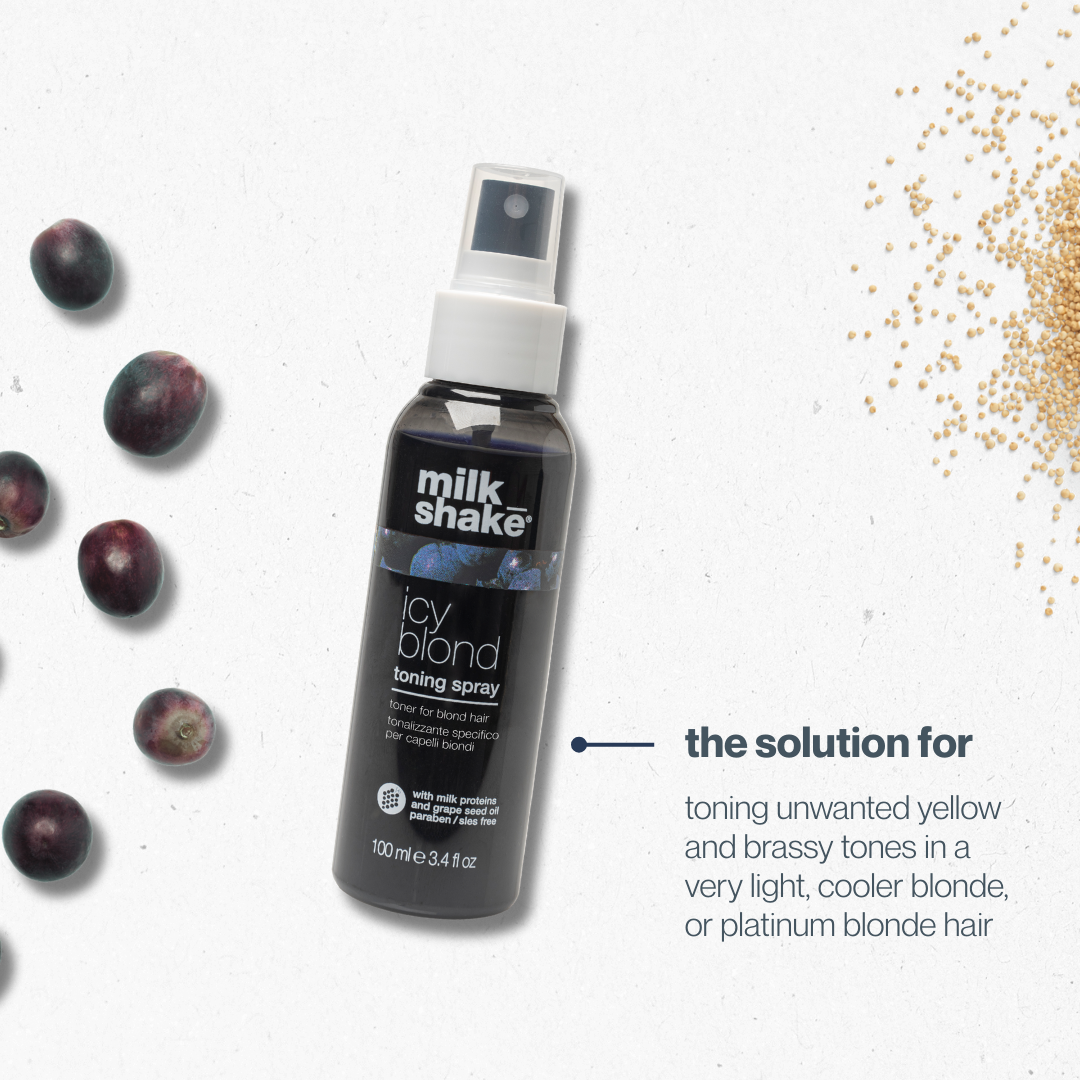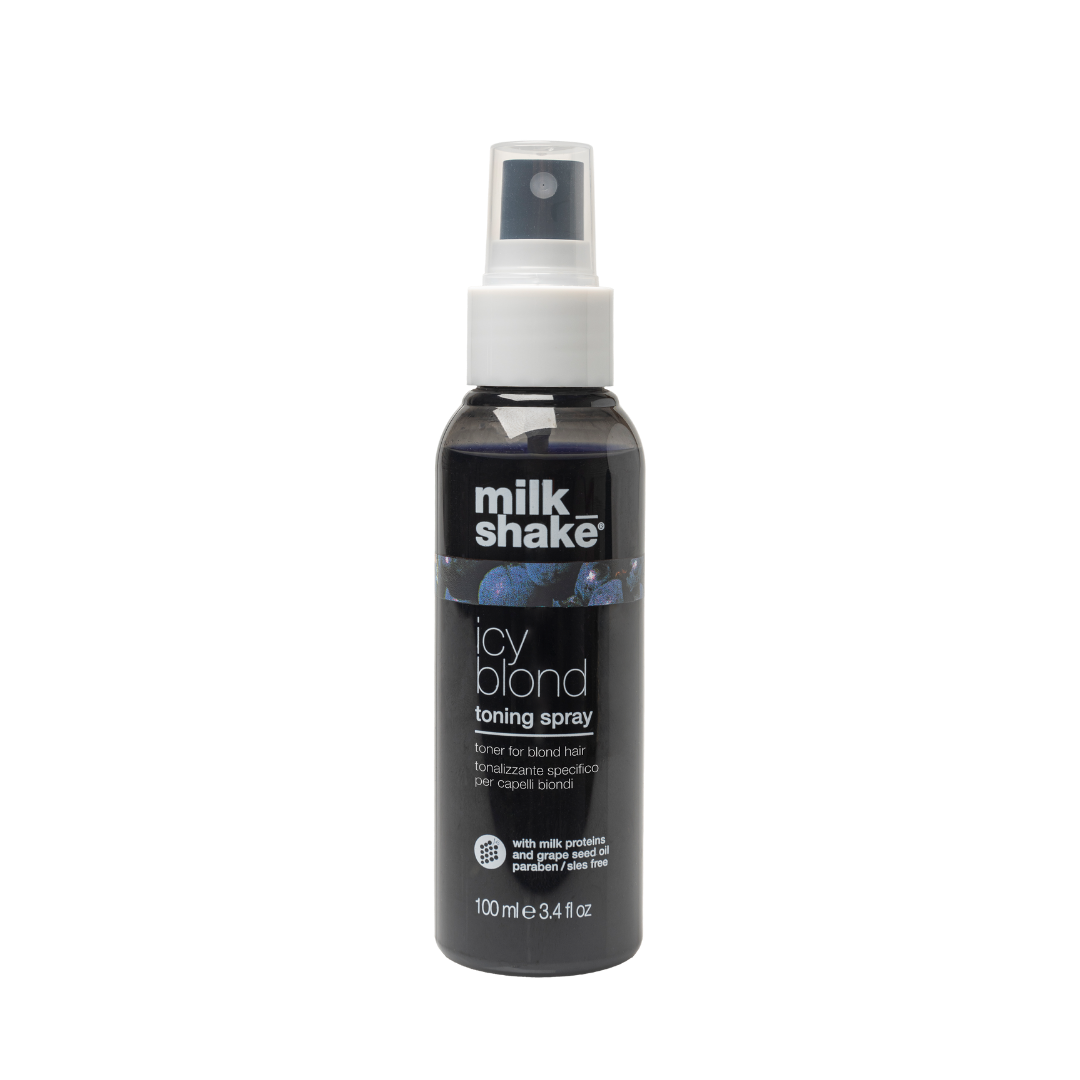 Refresh and perfect blonde tones with milk_shake® icy blond toning spray, a lightweight, no-rinse toning treatment designed to neutralise unwanted yellow, brassy, and orange tones in blonde or lightened hair.