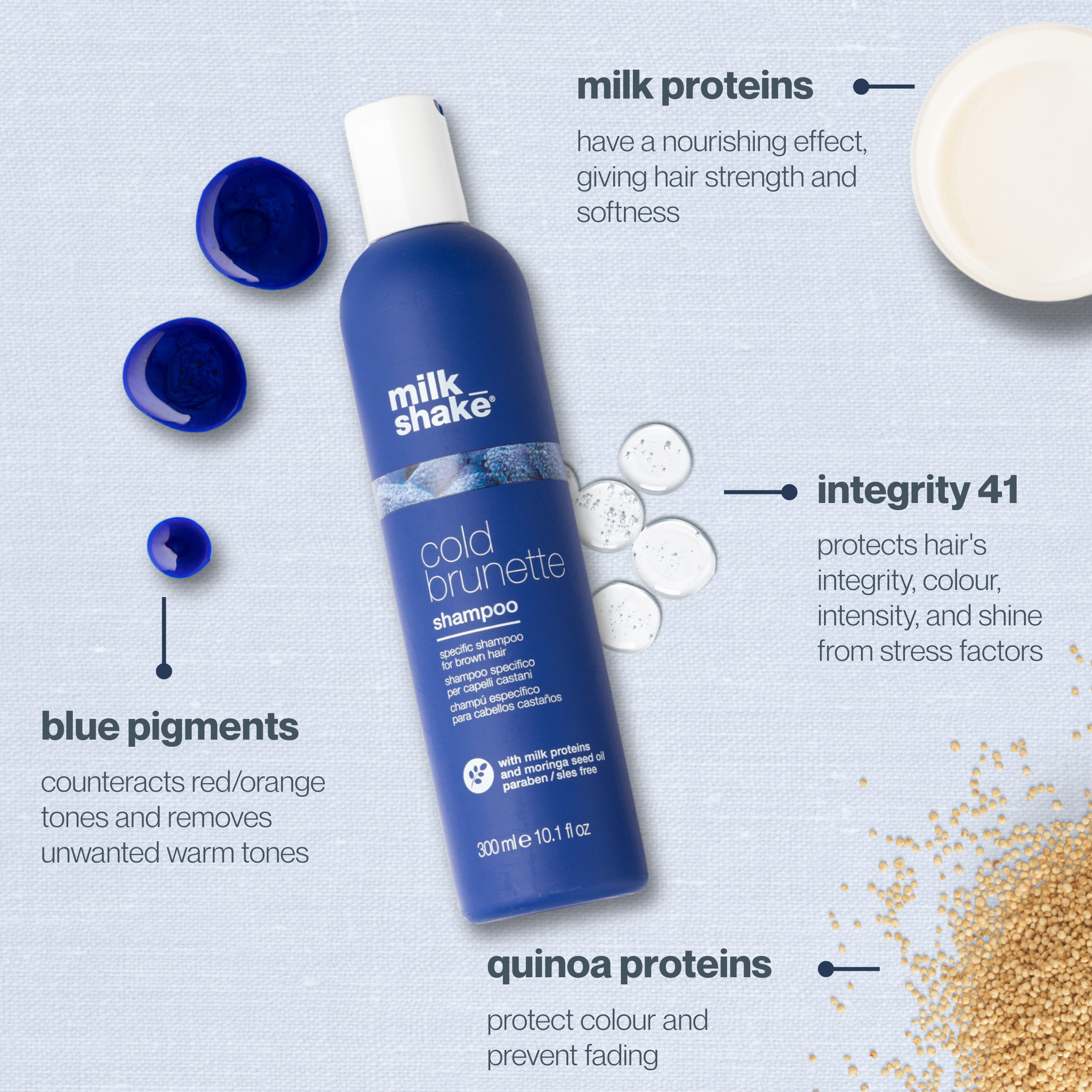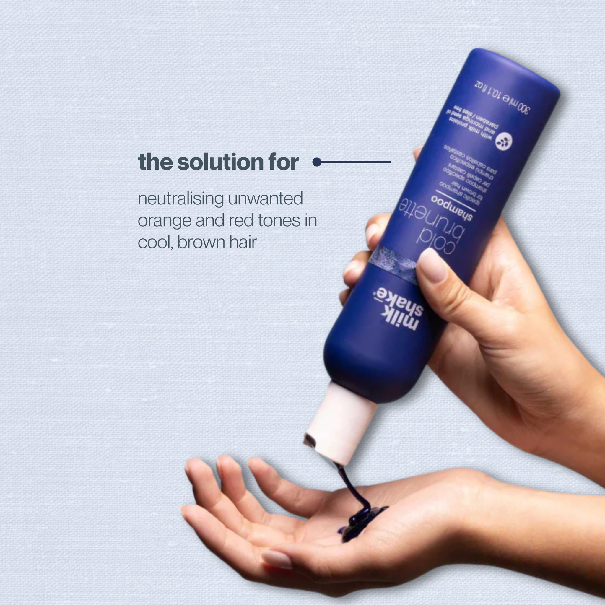 Our cold brunette shampoo enhances brown hair with every wash. This toning shampoo for brown hair has a deep blue pigment that cools unwanted warm tones. Key ingredients like integrity 41® make this shampoo safe for both natural & colour-treated brown hair. This shampoo is paraben-free, instead relying on ingredients like milk proteins & moringa oil to replenish brunette hair.