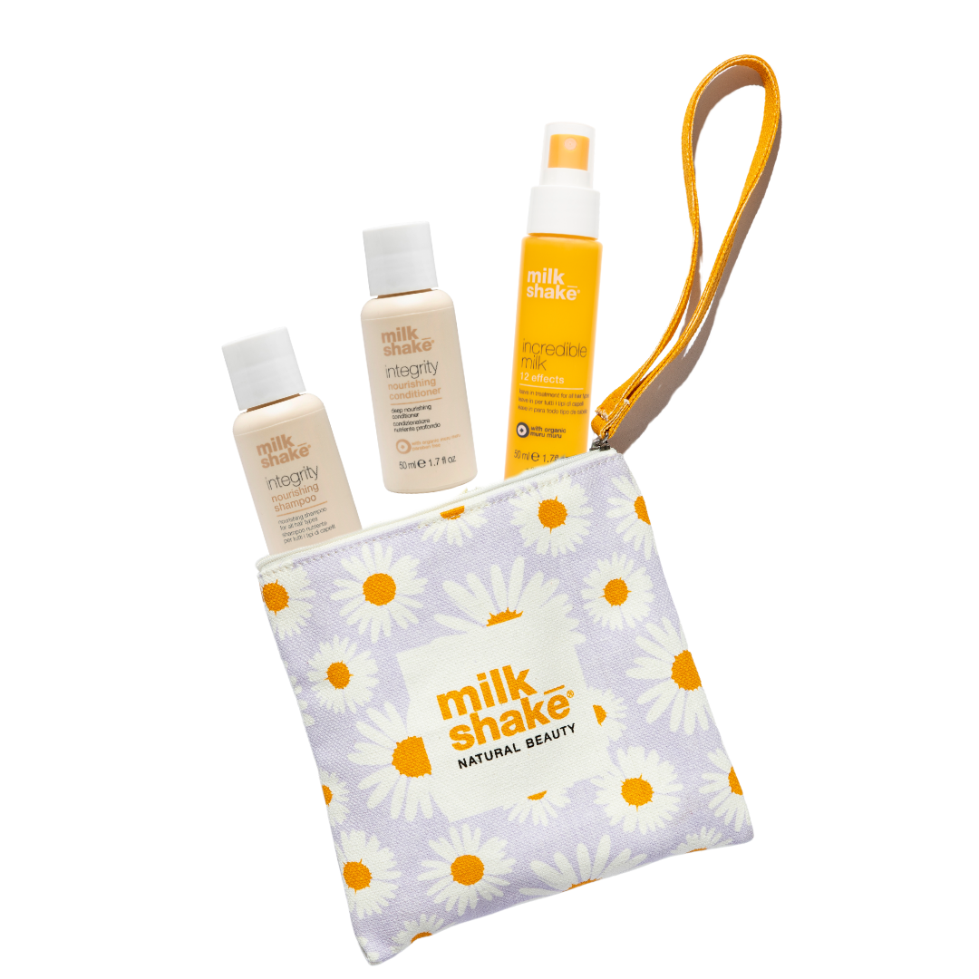 Our integrity Summer Mini Kit is designed to care for dry, damaged hair while keeping it soft, smooth and full of life, wherever you’re headed. Featuring our nourishing integrity shampoo, conditioner and our iconic incredible milk, all tucked into a cute daisy pouch, it’s your effortless routine on the go.