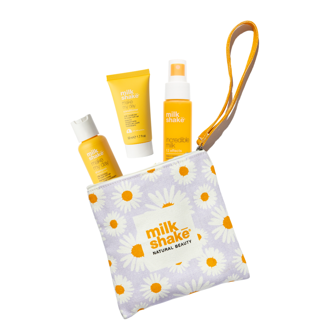 milk_shake hair care products including make my day and incredible milk in a daisy pouch