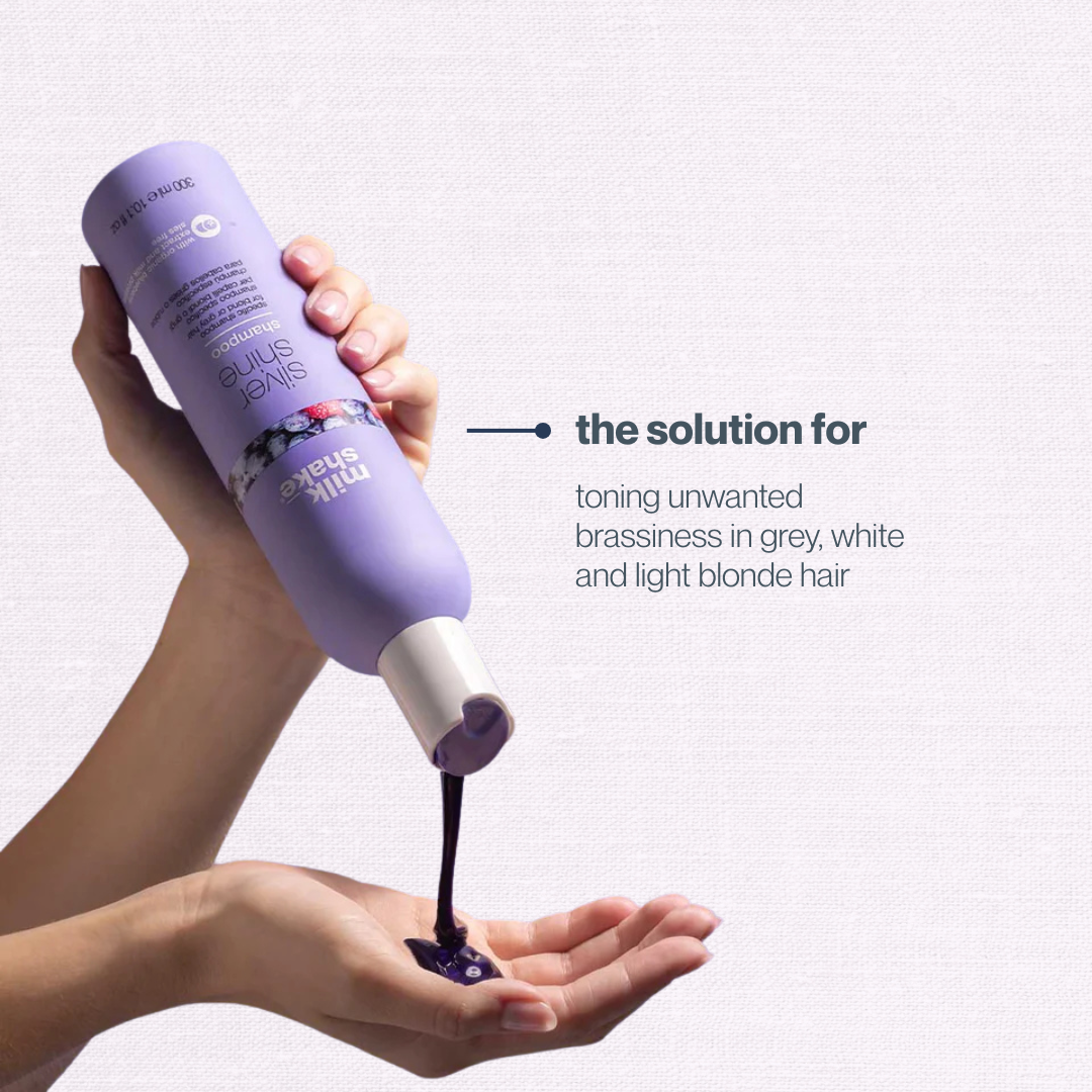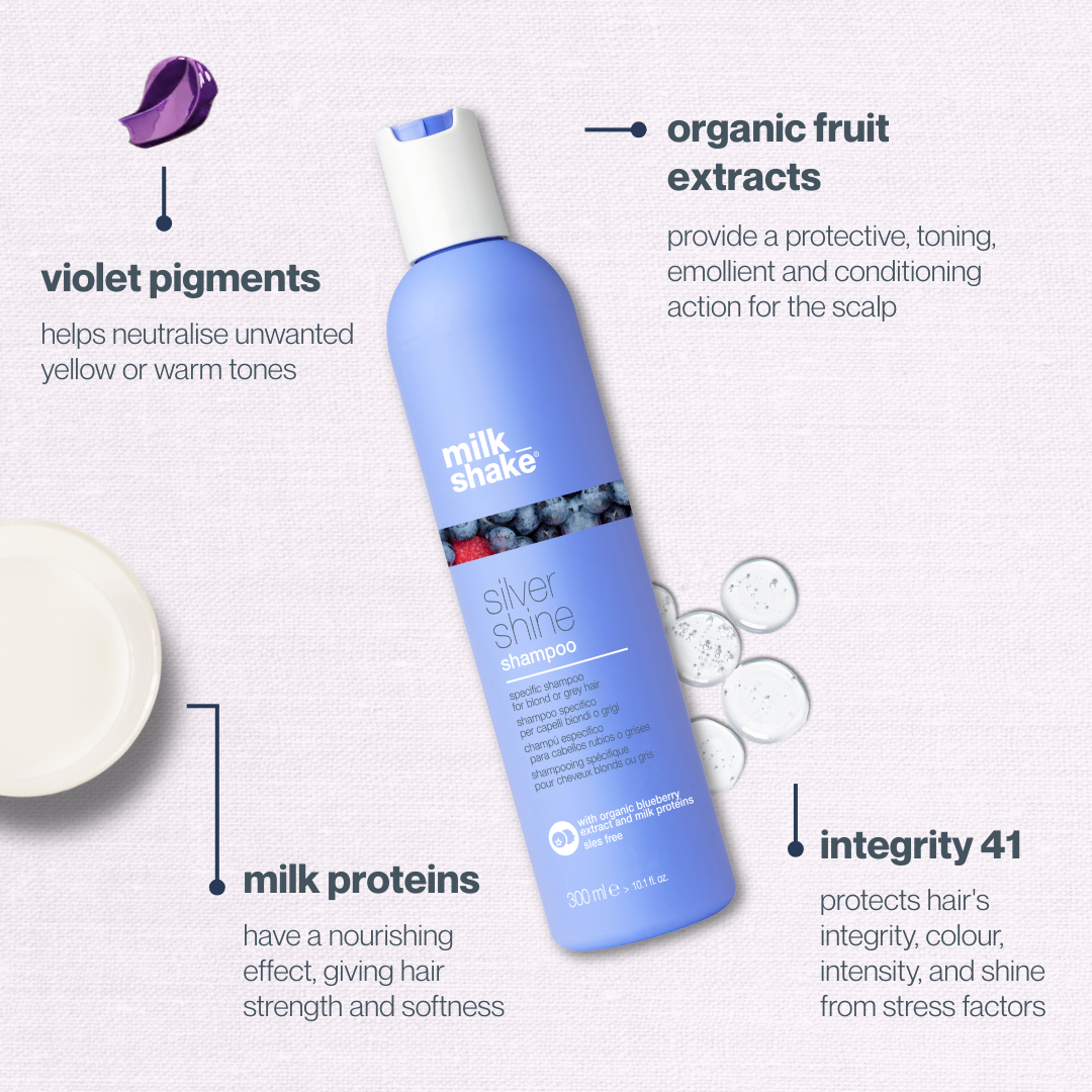 milk_shake® Silver Shine Shampoo combines the restructuring benefits of milk protein, vitamin-rich blueberries and violet pigment to brighten and neutralise unwanted yellow tones in blonde or grey hair.