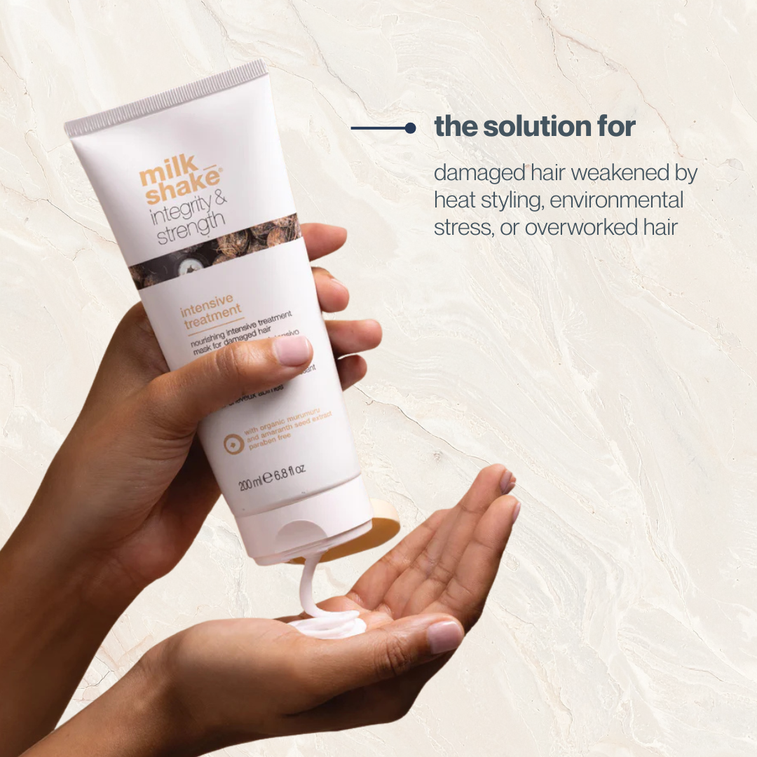 Revive and fortify your hair with our integrity & strength intensive treatment, a concentrated protein formula designed to restructure and strengthen damaged or chemically treated hair. Infused with amino acids, this professional treatment penetrates deep into the hair fibre to restore softness, shine, and resilience.